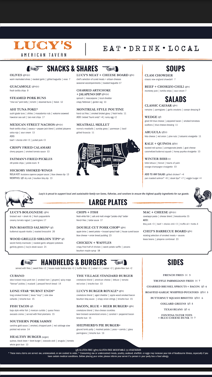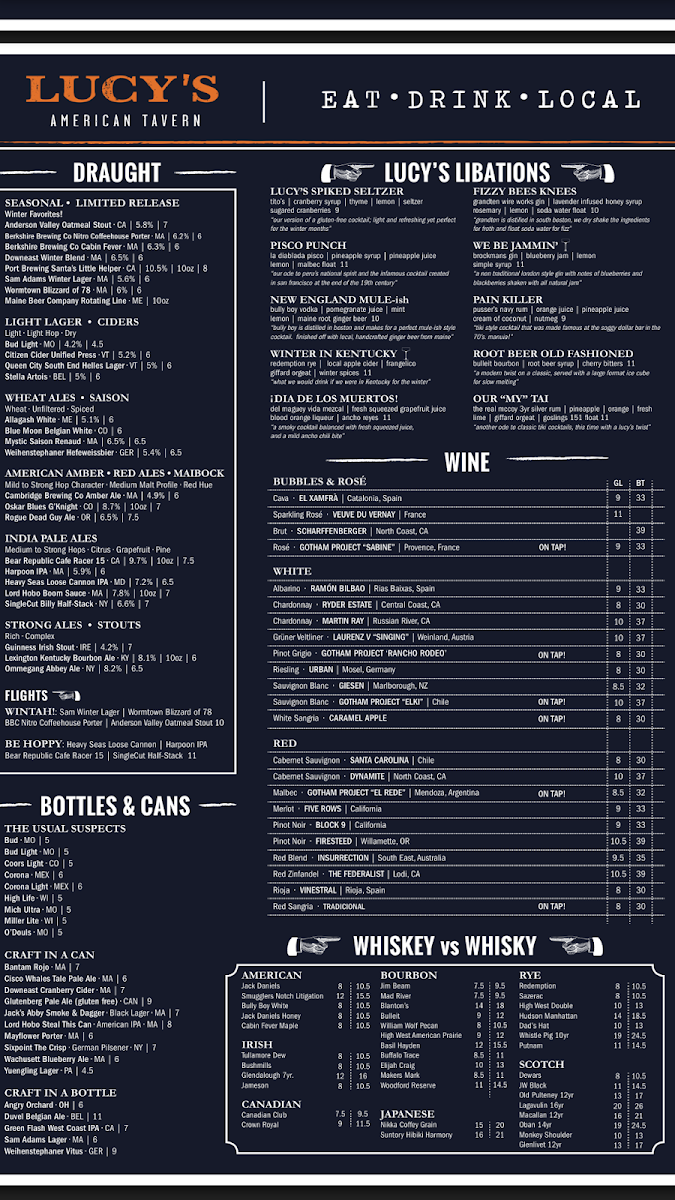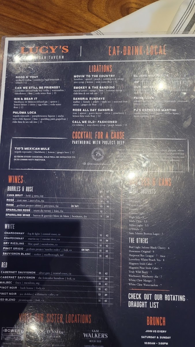 Lucy's American Tavern offers a menu that balances approachable American classics with comforting, casual bites perfect for any time of day. Whether you're stopping by for brunch, enjoying a laid-back lunch, or catching the game with friends, the menu reflects the relaxed, social atmosphere of the space.
